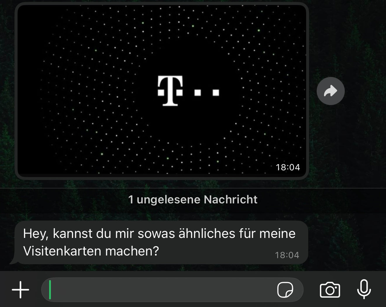 Der Kunde fragt über WhatsApp, ob wir etwas Ähnliches gestalten können. Ein individuelles Visitenkartendesign für einen Telekommunikationskunden, ganz nach seinen Vorstellungen.